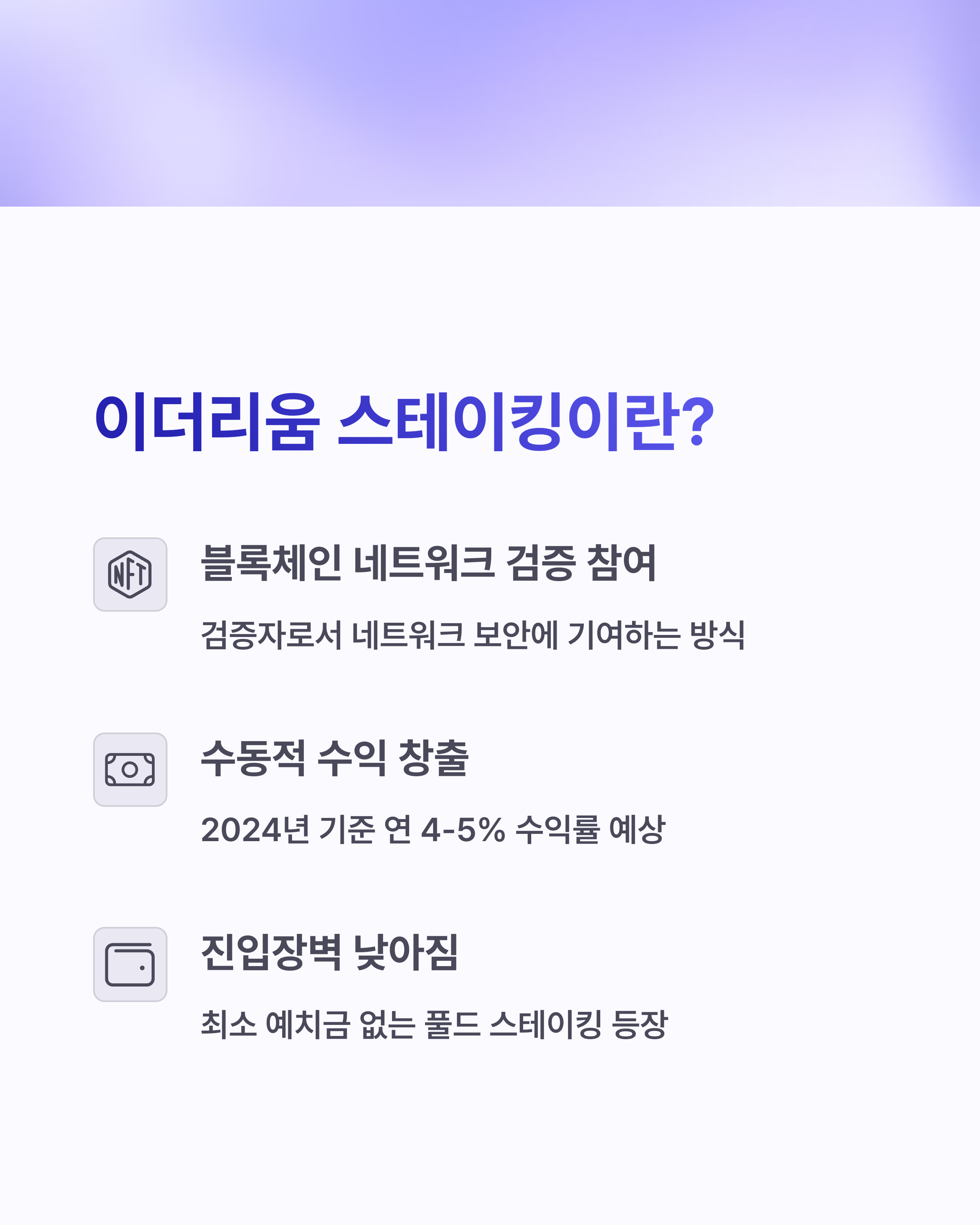 이더리움 스테이킹은 2025년 현재 PoS 시스템의 정착과 함께 더욱 안정적이고 수익성 있는 투자 수단으로 자리잡고 있습니다. 소액부터 시작할 수 있는 유동성 스테이킹과 초보자 친화 플랫폼의 등장으로, 누구나 쉽게 참여 가능한 환경이 마련됐죠.