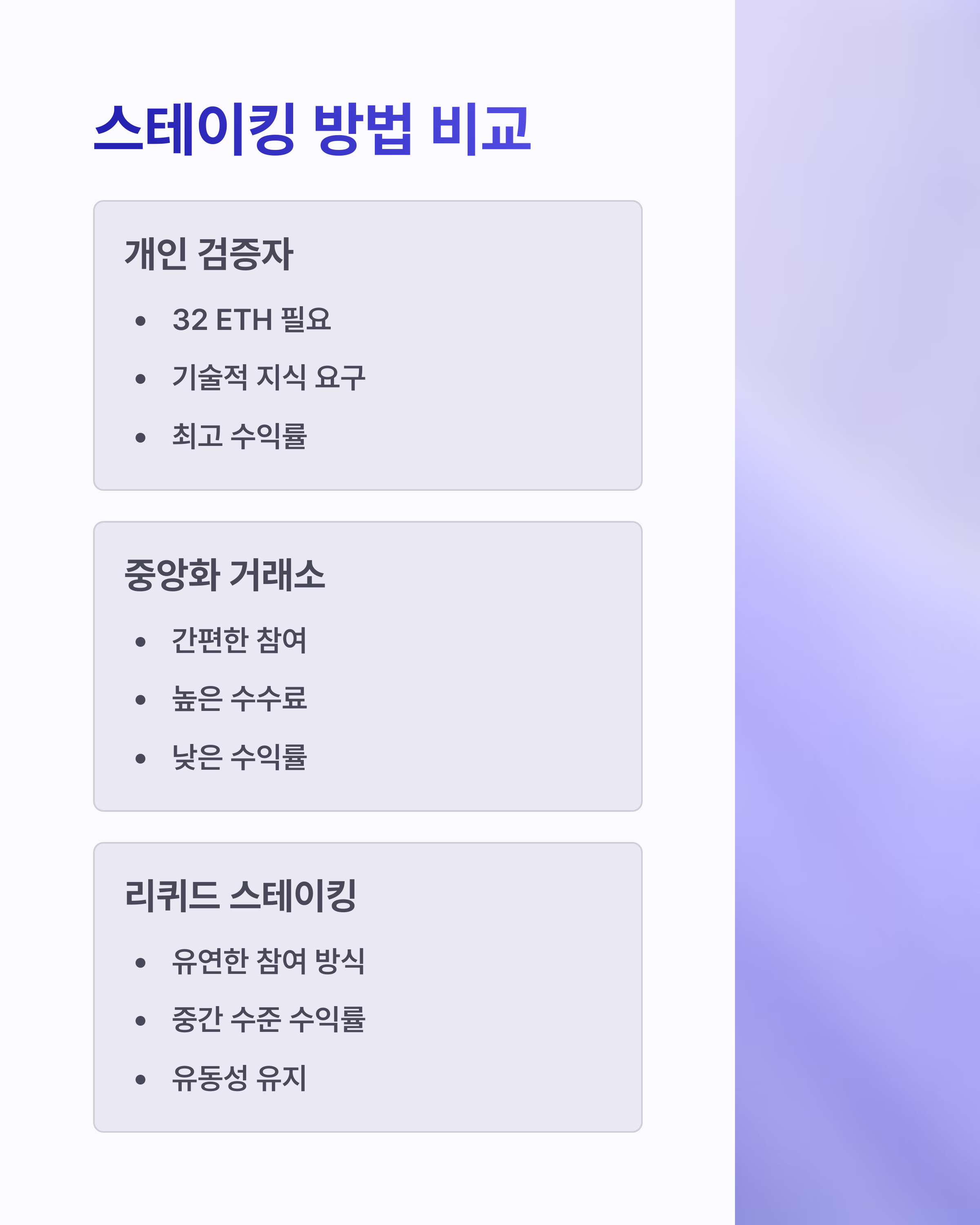 | 방식 | 필요 ETH | 기술 지식 | 보상률 | 유동성 |