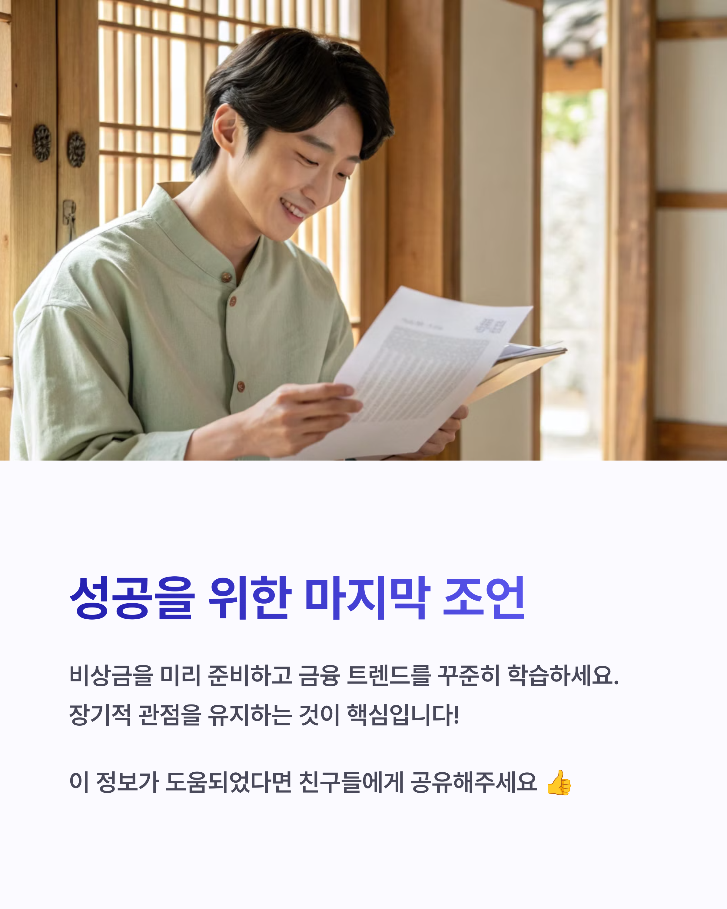 - ✅ 소액 분산 투자: ETF, 우량주 등 안정 자산으로 시작하세요.
