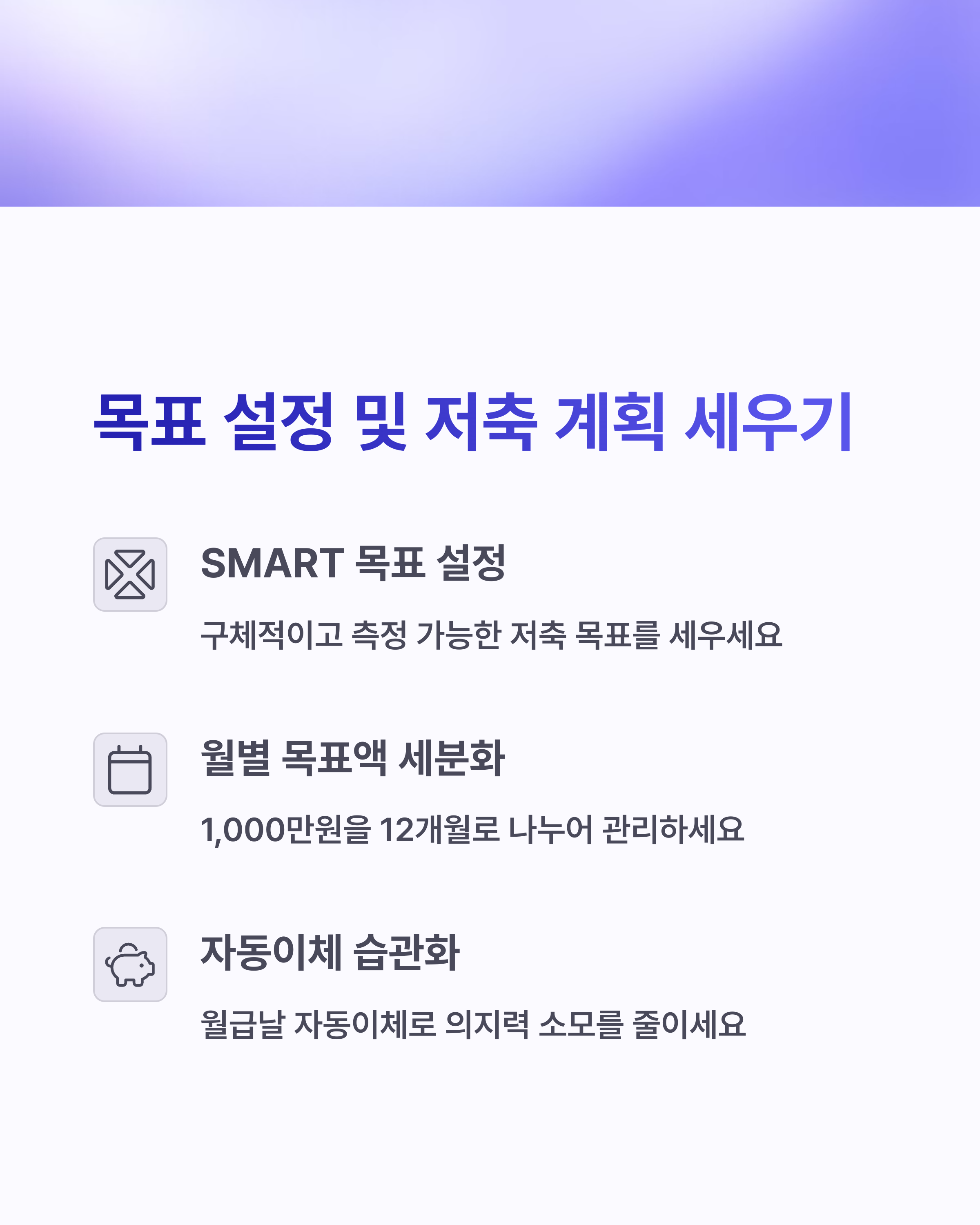 1,000만 원이라는 목표 금액을 실현 가능하게 만들기 위해 가장 먼저 해야 할 일은 구체적인 저축 계획 수립입니다.