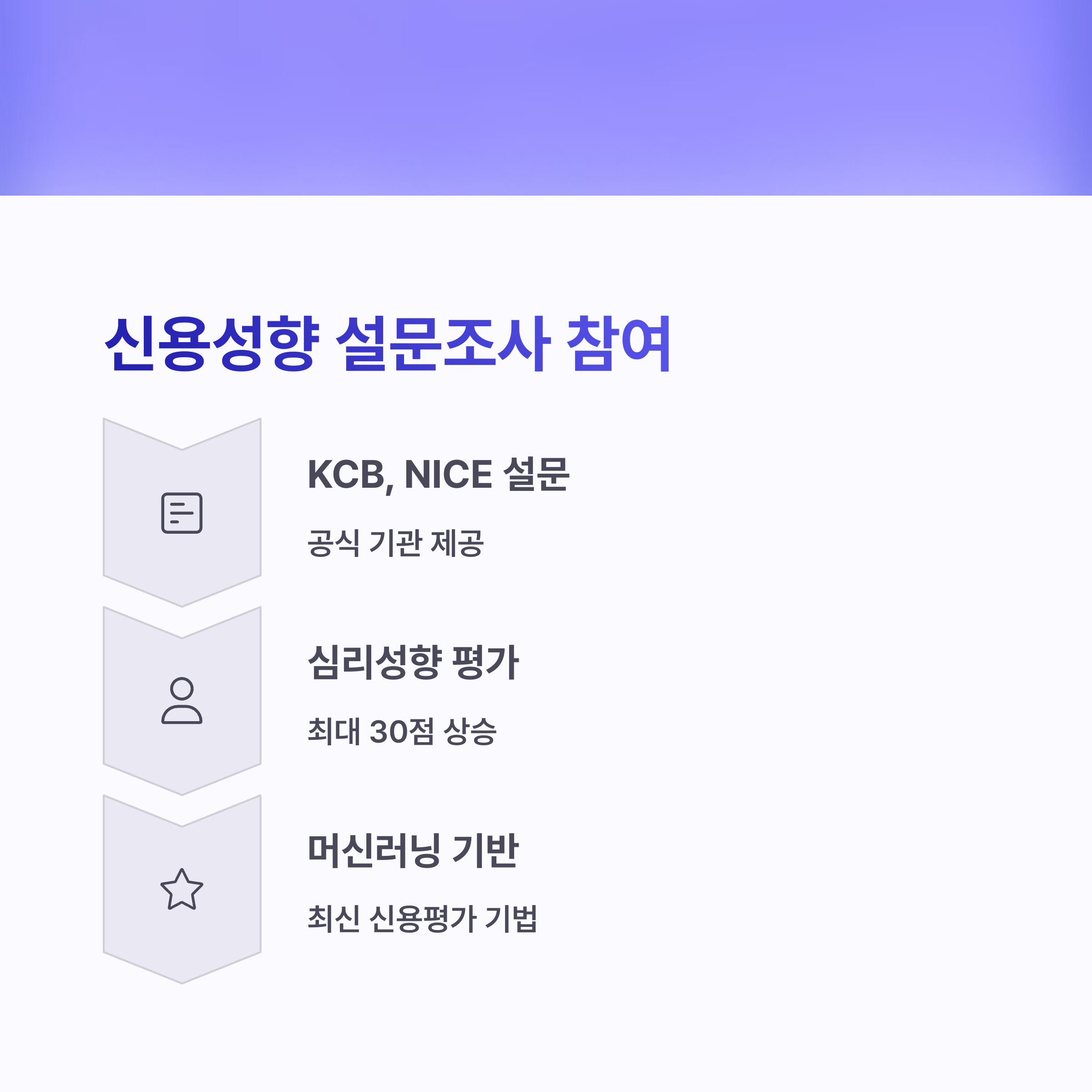 KCB(코리아크레딧뷰로) 홈페이지에서 참여할 수 있으며, 설문 참여 즉시 최대 30점까지 점수 반영이 가능합니다. 간단한 설문이지만 실질적인 점수 향상에 도움을 줍니다.