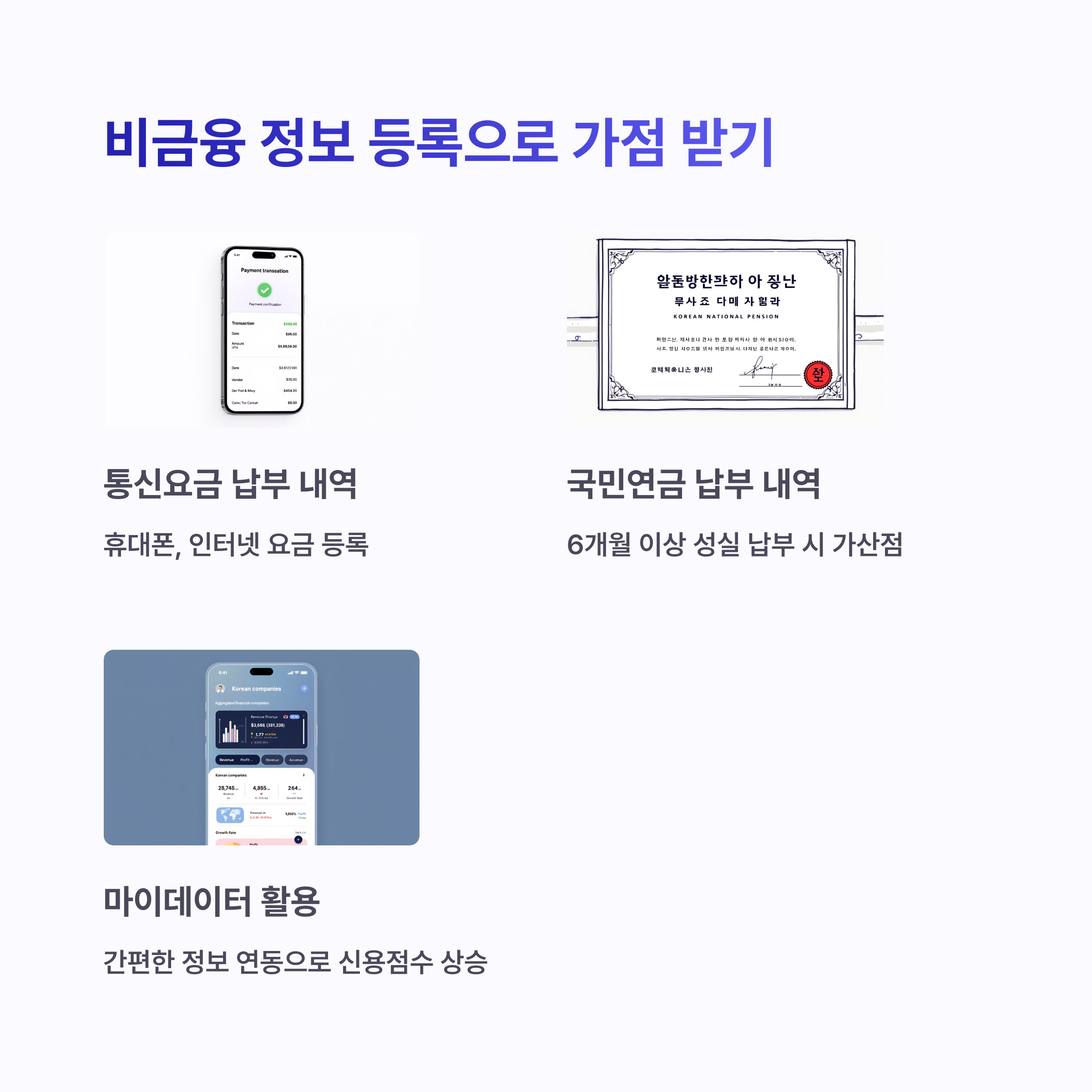통신요금, 국민연금, 건강보험료 납부 이력이 주요 항목입니다. NICE나 KCB에 제출하면 신용점수에 가점으로 적용되며, 특히 통신요금 납부는 쉽게 등록 가능한 비금융 정보 중 하나입니다.