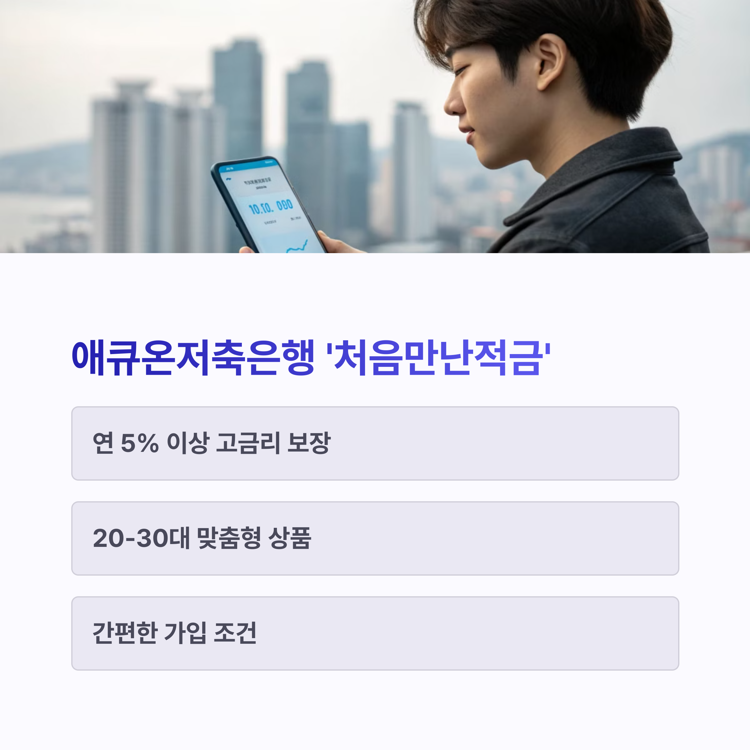 애큐온저축은행의 대표 상품인 '처음만난적금'은 연 8.0%의 최대 금리를 자랑하는 고금리 적금 상품입니다.