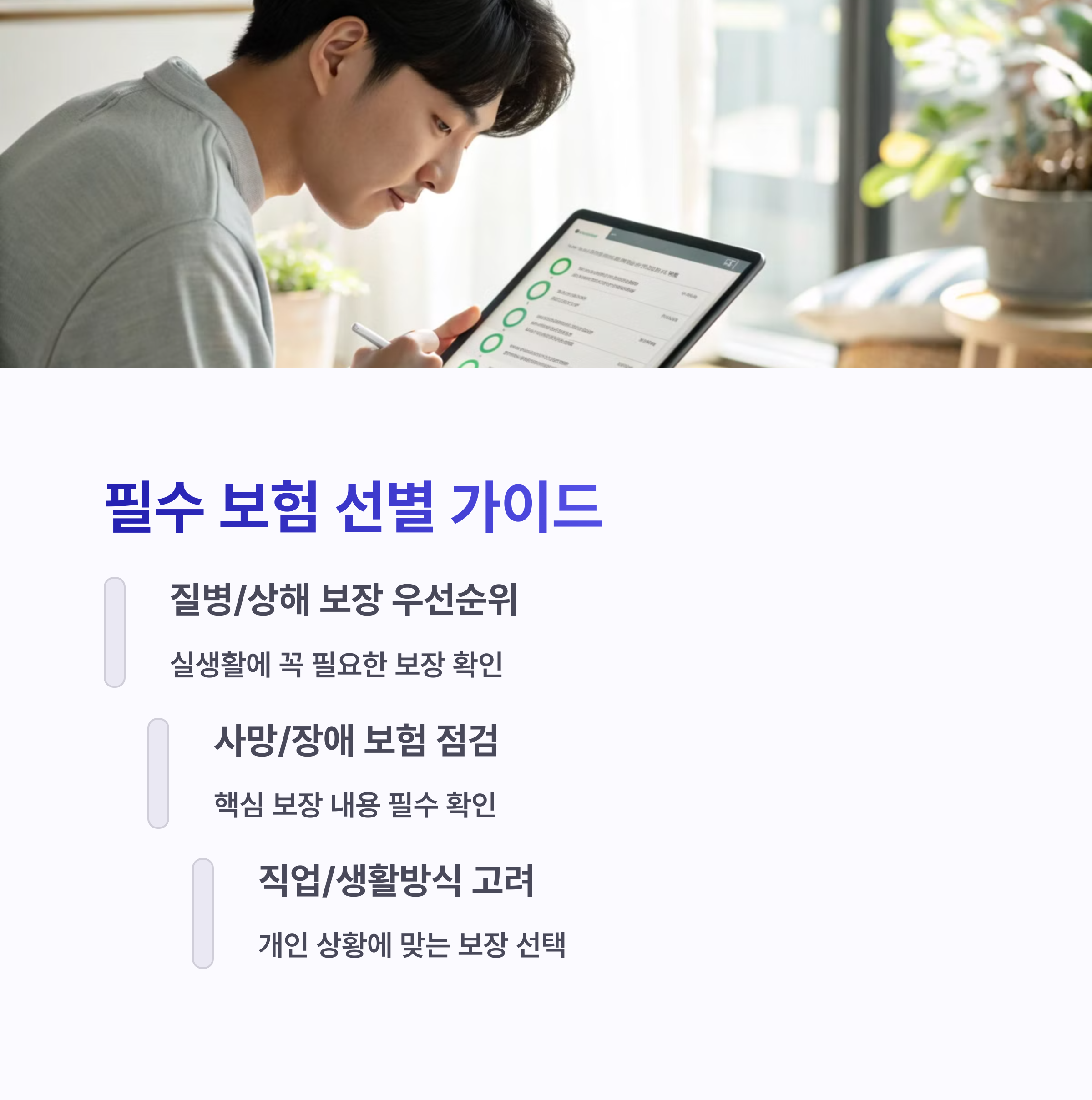 보험에 처음 입문하는 사회초년생이라면, 당연히 예산의 한계가 있기 마련입니다. 이럴 때는 가장 기본이 되는 보장만 선택해야 하며, 선택 기준은 “나에게 꼭 필요한 상황에 대응할 수 있느냐”입니다.