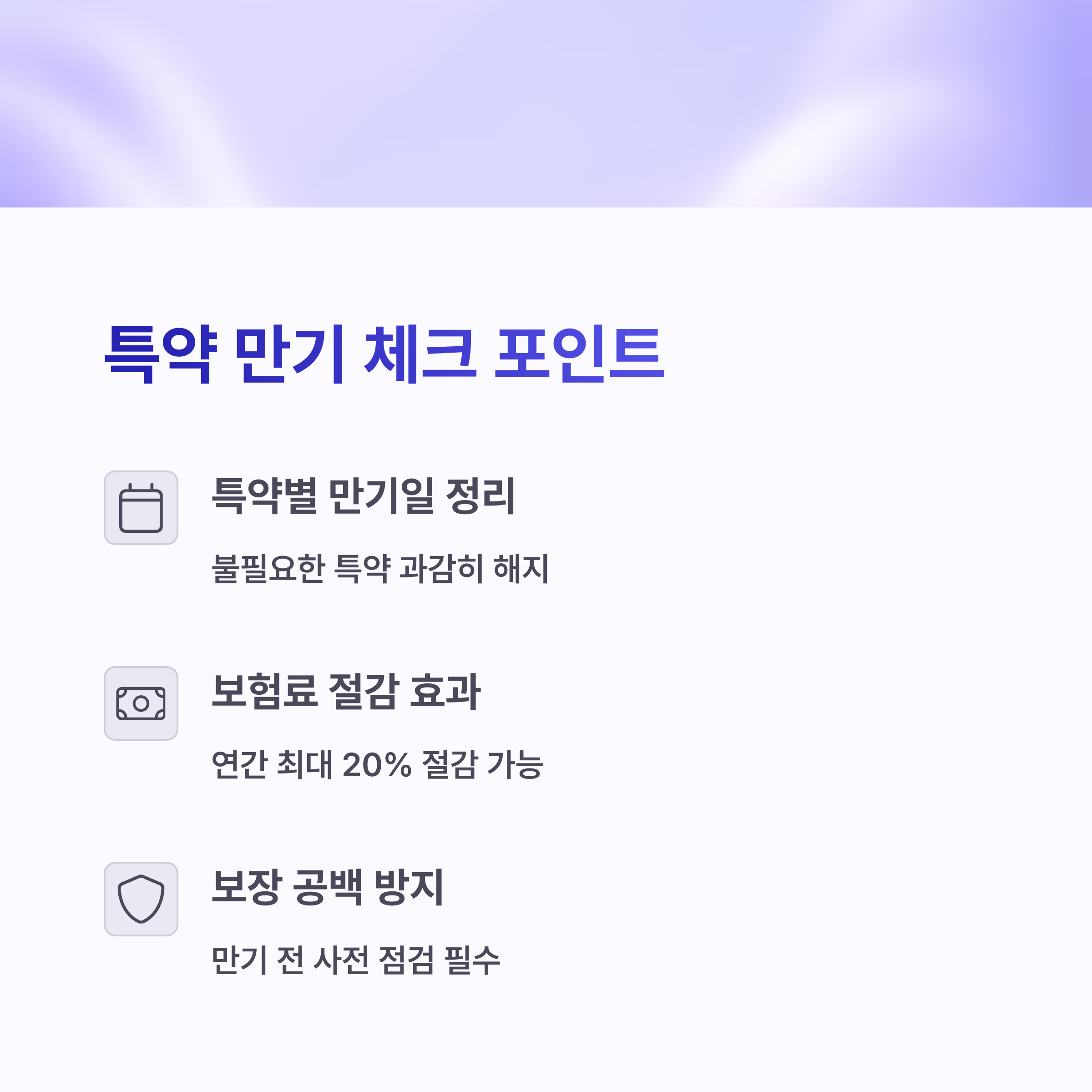 가장 많이 쓰는 실손보험 특약 역시 종종 갱신형 15년 만기 상품으로 구성돼 있어, 갱신 후 보험료가 크게 오를 수 있습니다. 특약 만기와 갱신 조건은 반드시 가입 전 약관에서 직접 확인해야 합니다.