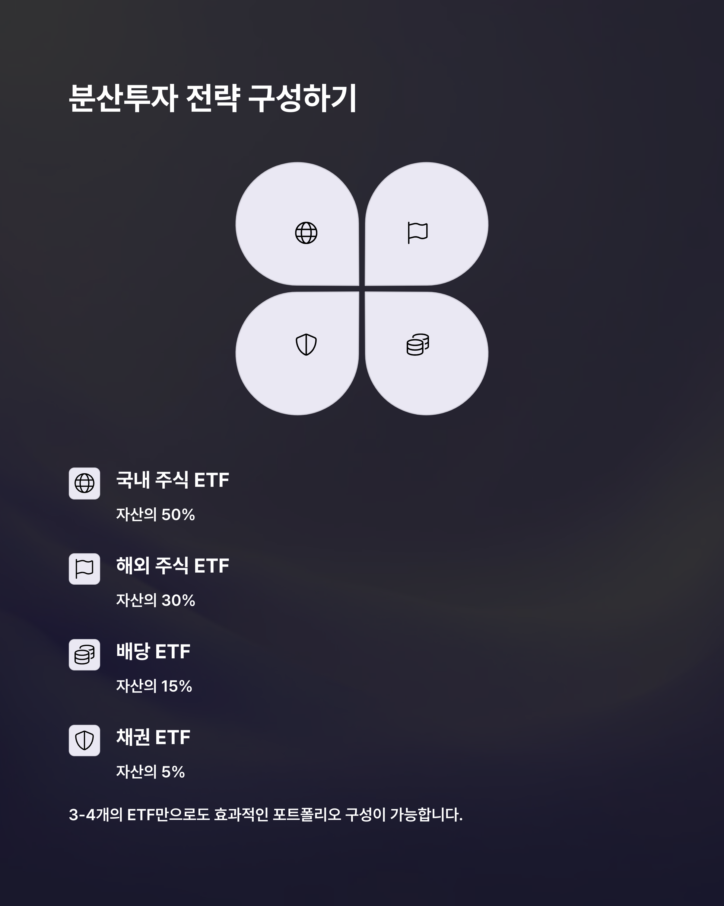 ETF 투자의 핵심은 분산투자 전략에 있습니다. 단일 자산에만 집중 투자할 경우 시장 리스크에 민감하게 반응하게 되지만, 다양한 자산군에 분산 투자하면 리스크를 줄이고 수익률 안정성을 확보할 수 있습니다.