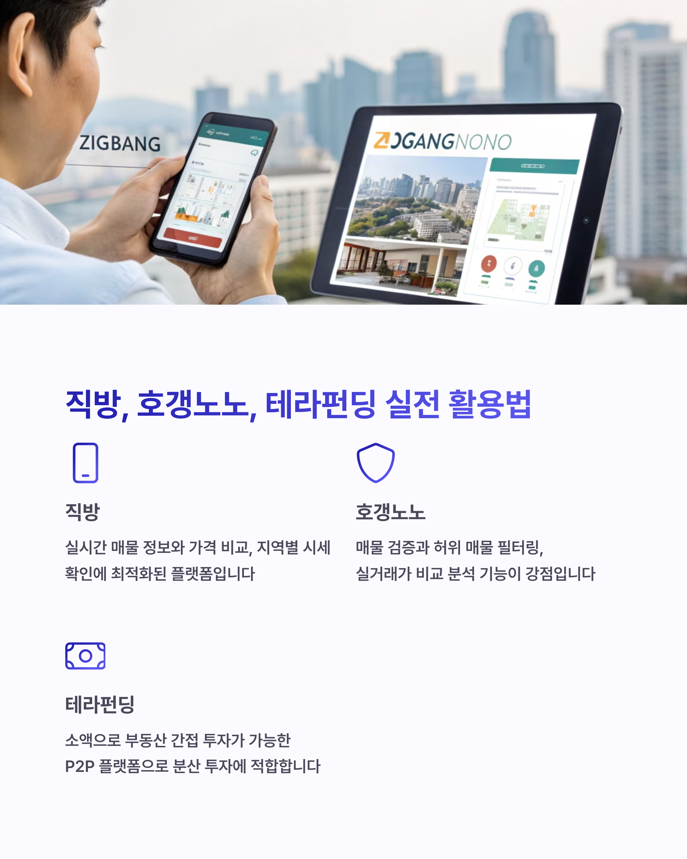 특히 직방, 호갱노노, 테라펀딩 같은 플랫폼을 잘 활용하면 데이터 기반의 똑똑한 판단이 가능하죠.