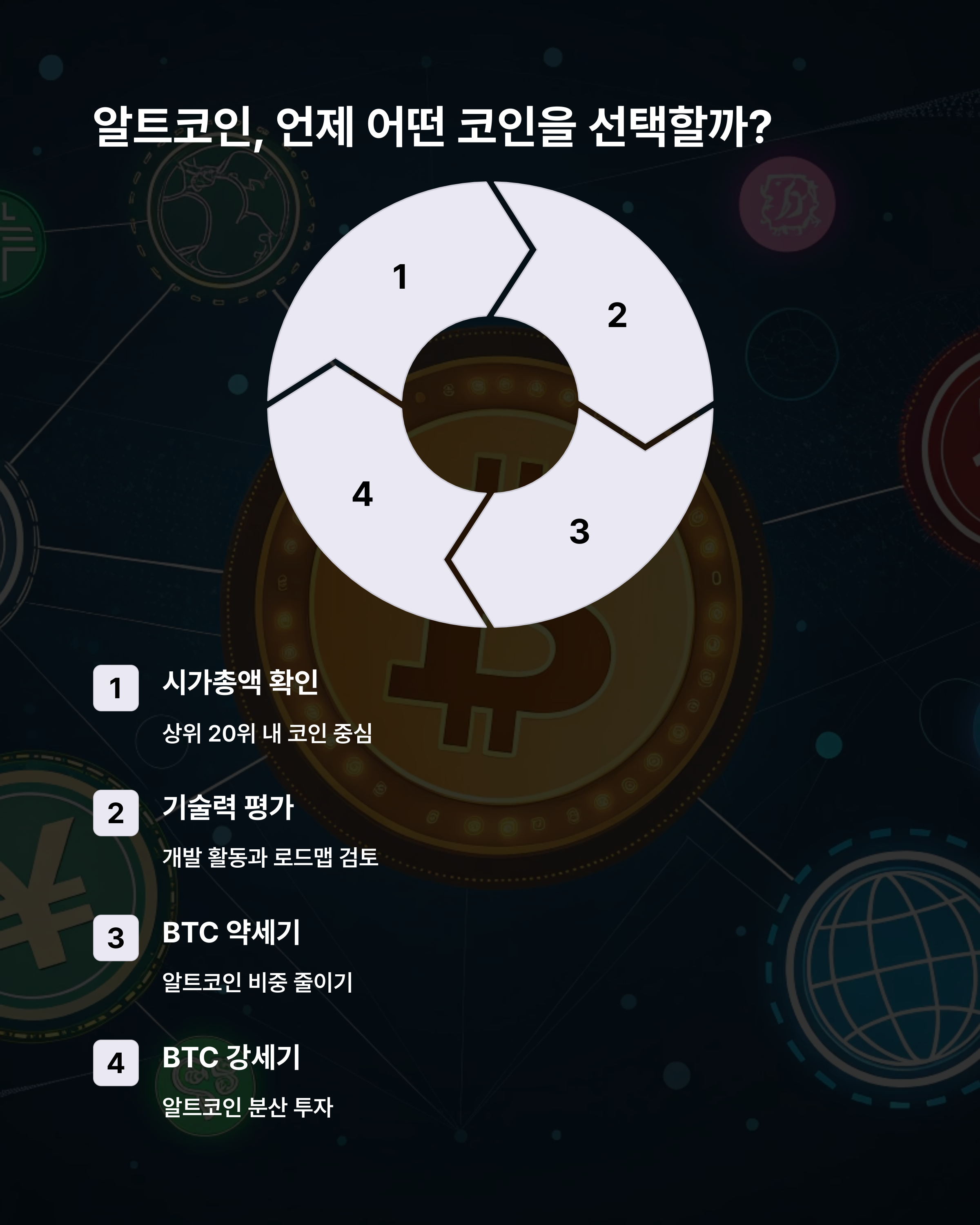 A. 일반적으로 비트코인 가격이 안정된 이후, 즉 도미넌스가 횡보하거나 하락세로 전환될 때가 알트코인 진입의 기회입니다. 특히 알트코인 시즌 초기에는 급격한 상승이 나타나므로 이 시점을 잘 포착해야 합니다.