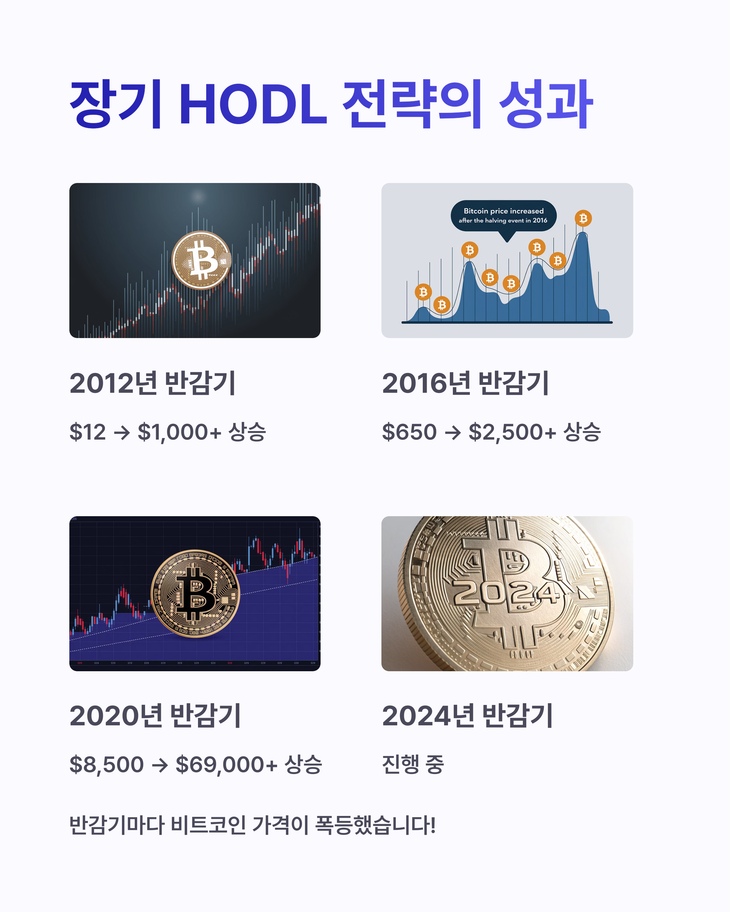 | HODL 전략 | 반감기 전후 매수, 1년 이상 보유 | 300% 이상 수익 기대 |