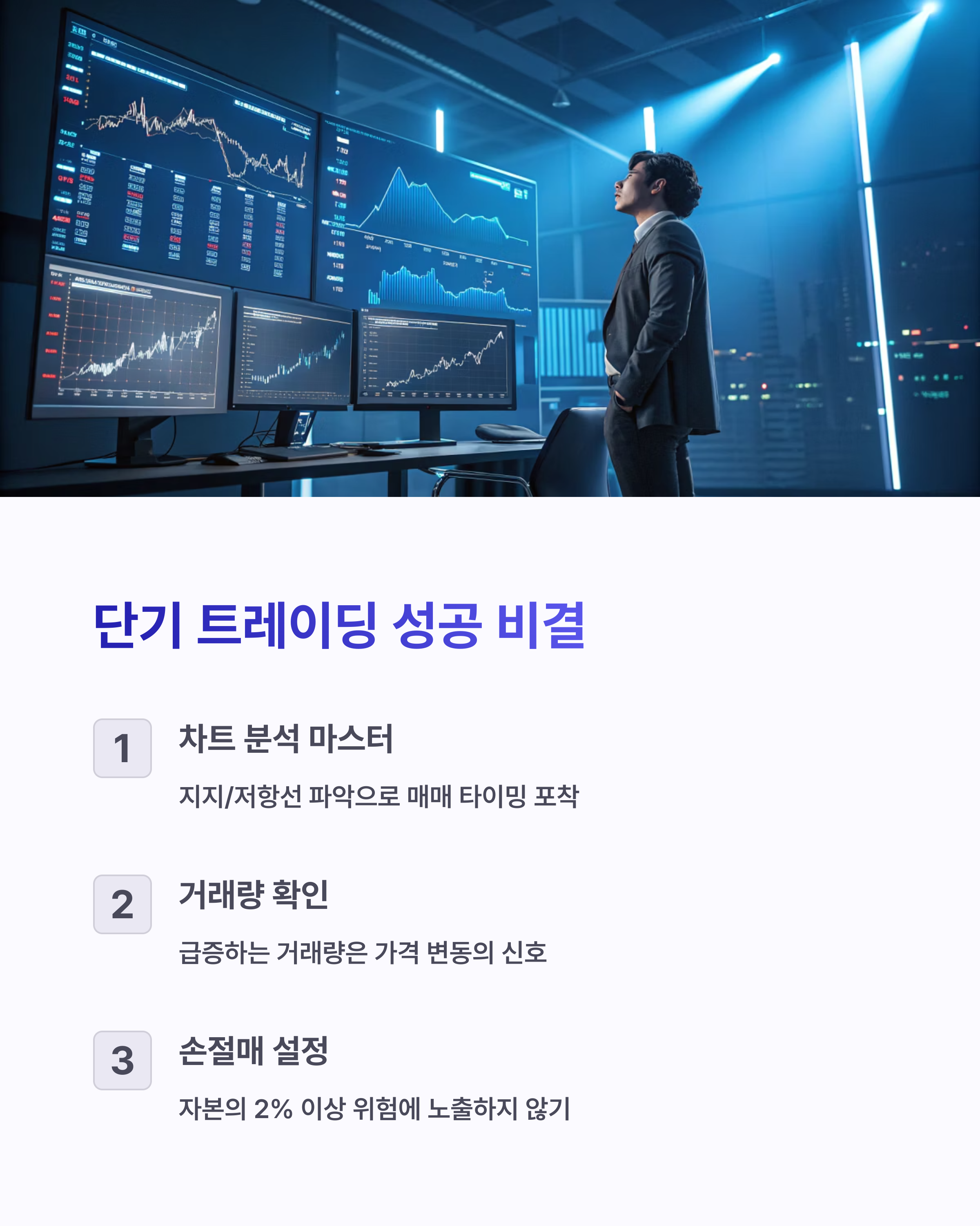 단기 전략의 핵심은 리스크 관리입니다. 반드시 스톱로스(Stop Loss)를 설정하고, 감정에 휘둘리지 않는 거래가 중요합니다.