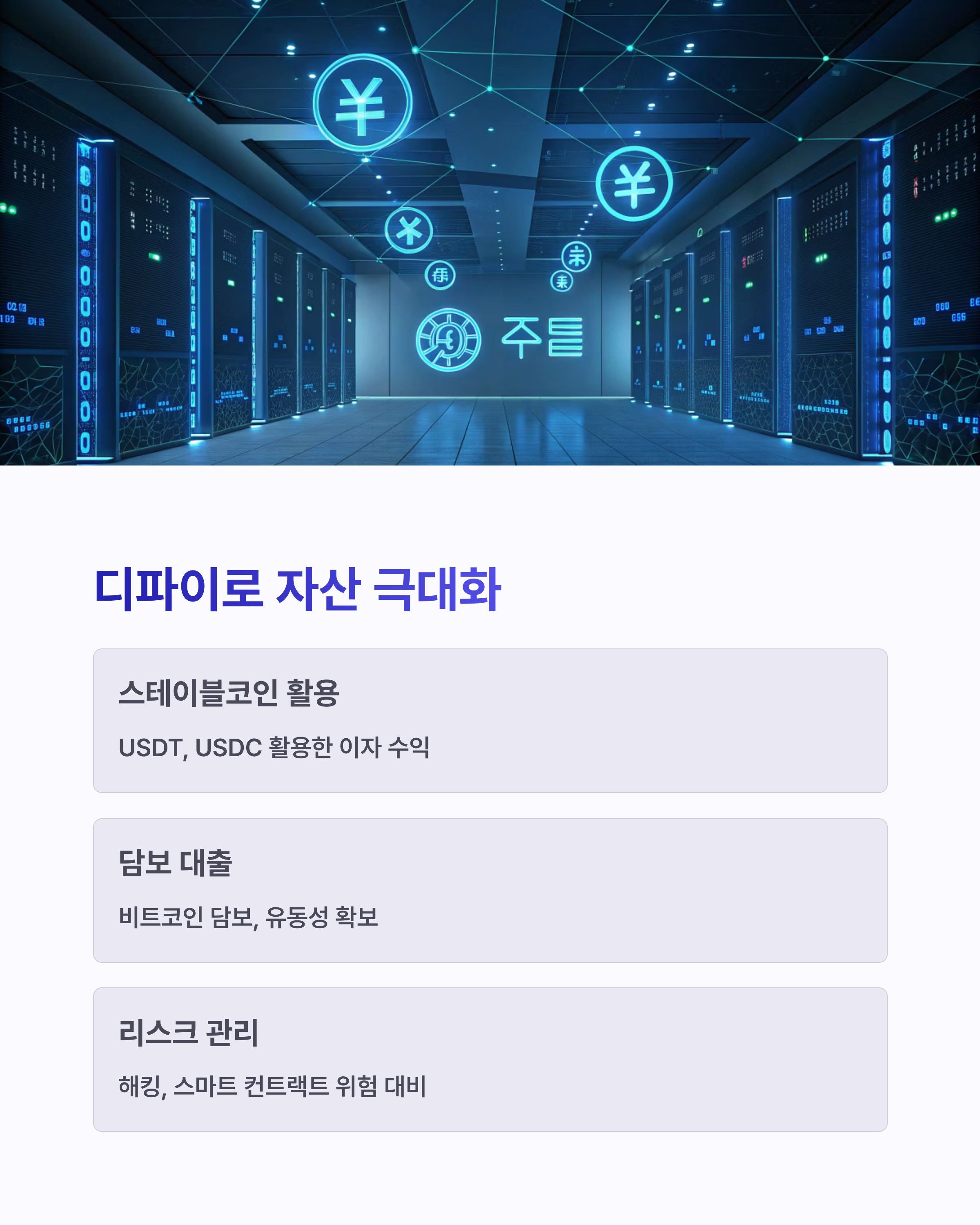 | 디파이 활용 | 담보 대출, 이자 수익 확보 | 연 수익률 5~10% |