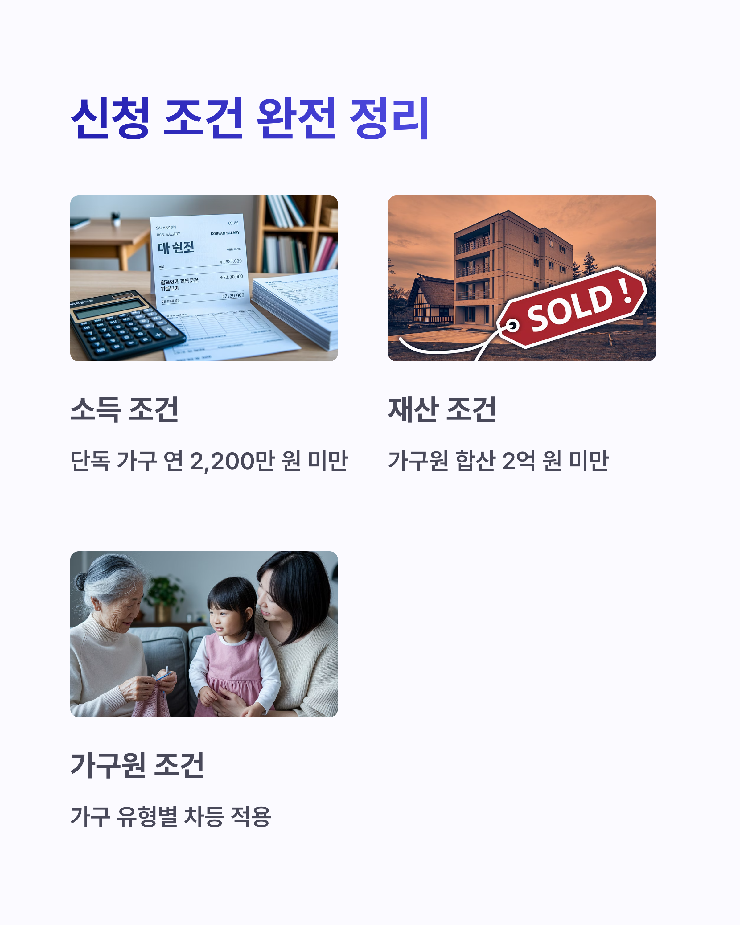둘째는 재산 요건입니다. 가구원 전체의 합산 재산이 2억 원 미만이어야 하며,
