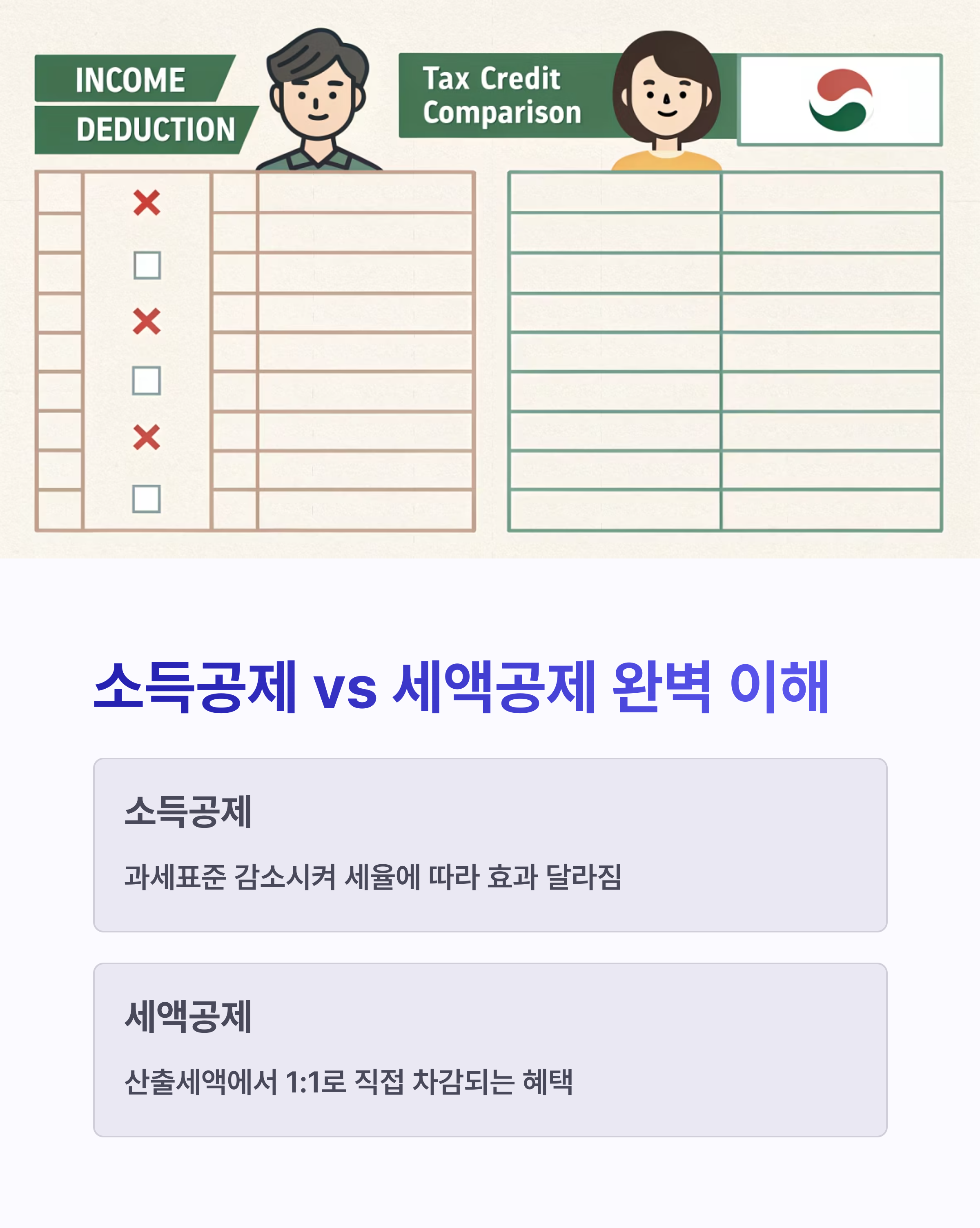 | 적용 방식 | 과세표준을 낮춤 | 산출세액에서 직접 차감 |