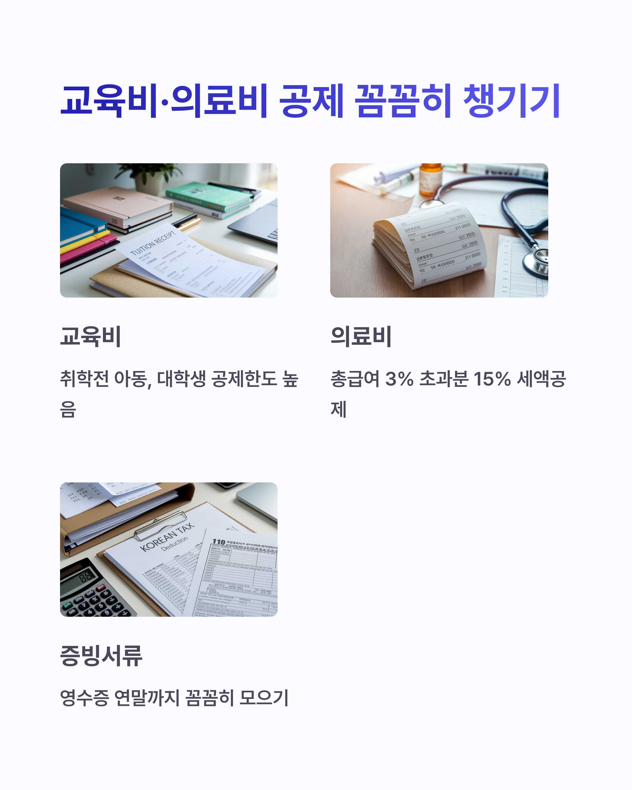 ⚠️ 주의: 교육비, 의료비는 증빙이 필수입니다. 관련 영수증은 국세청 자동 불러오기 외에도 개별 보관이 중요합니다.