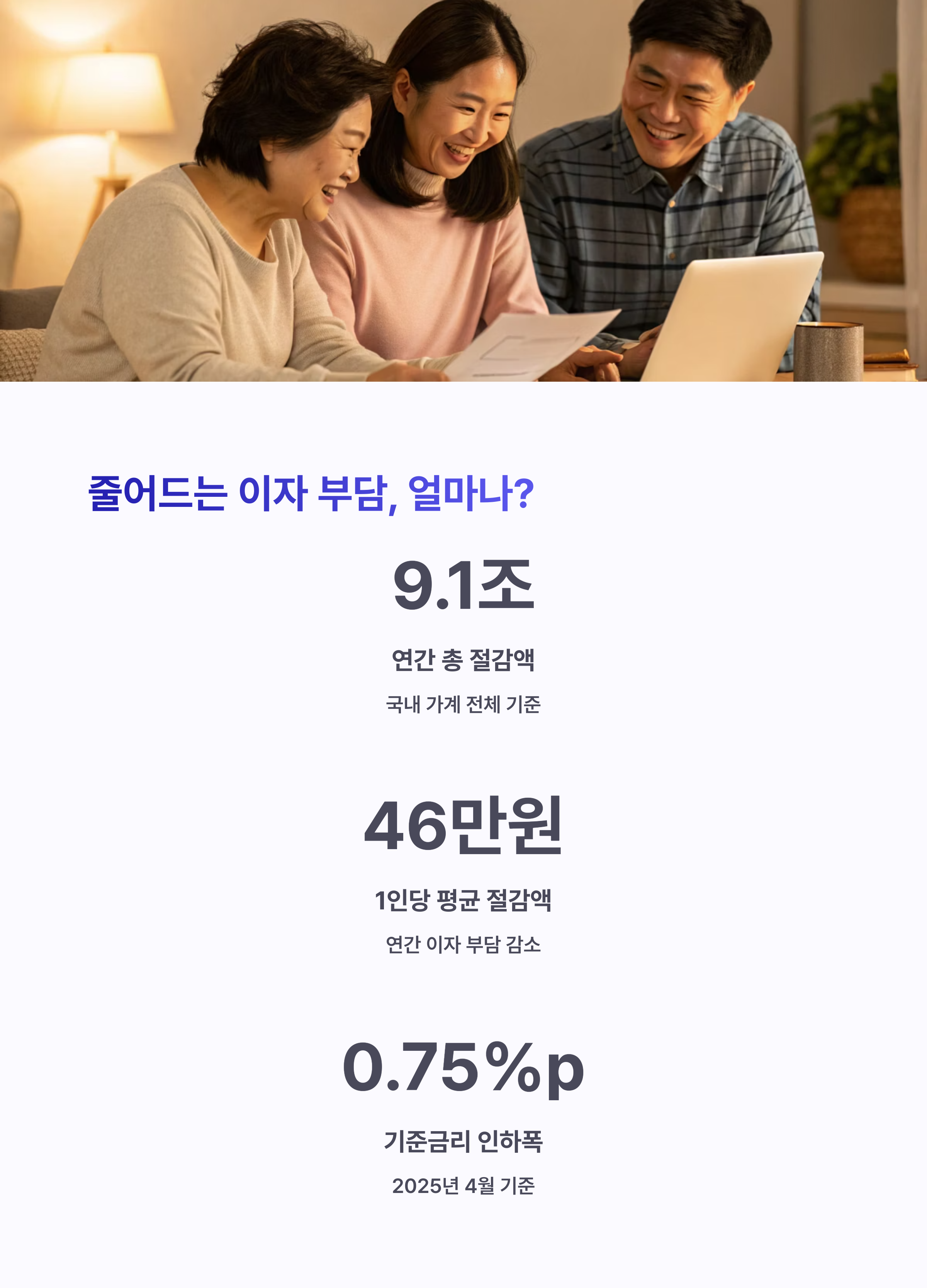 금리 인하의 체감 효과는 무엇보다 '이자 부담'에 있습니다. 한국은행 발표에 따르면, 기준금리 0.75%p 인하로 인해 가계 전체의 연간 이자 부담은 약 9조 1,000억 원 감소할 전망이에요.