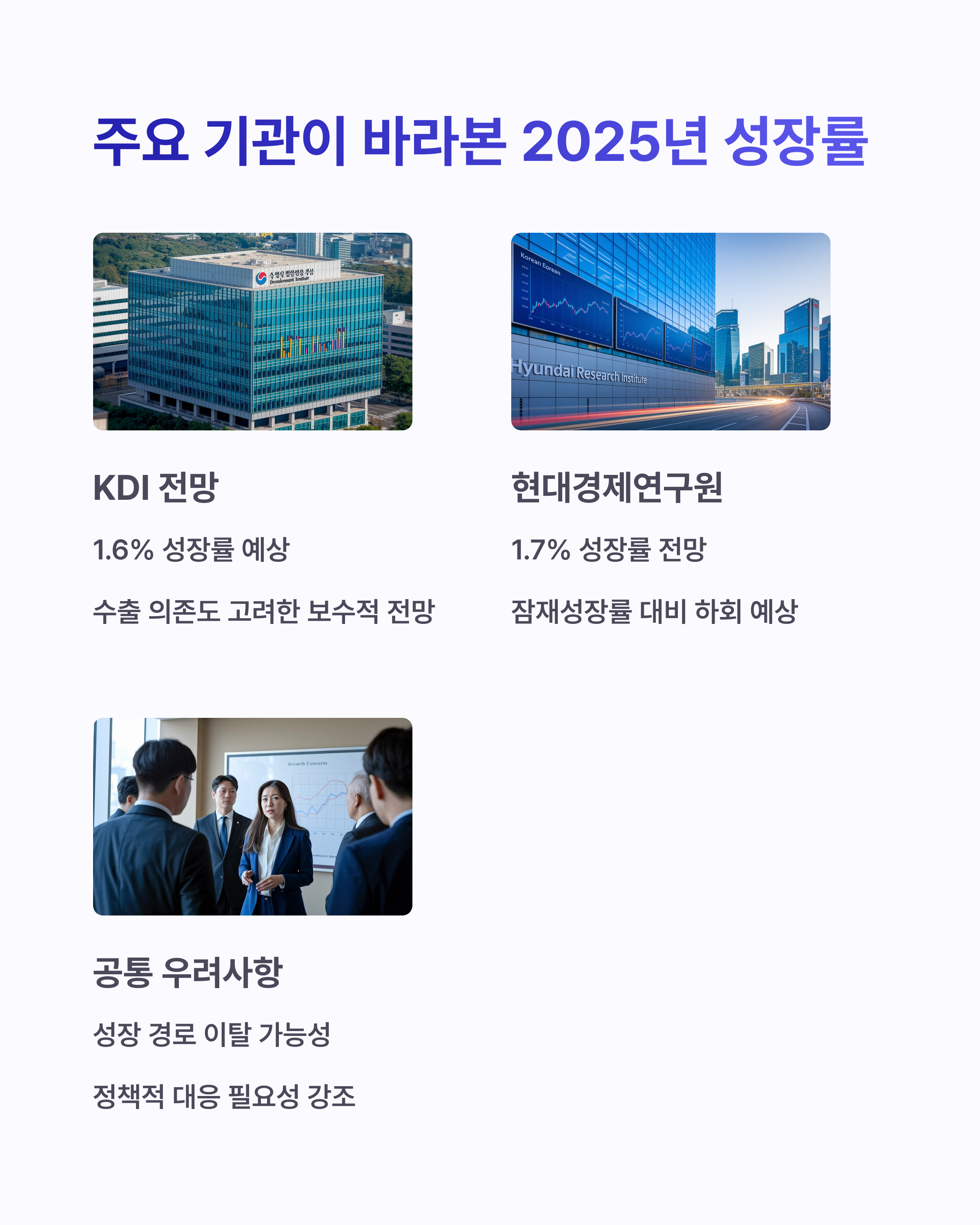 KDI는 2025년 경제성장률을 1.6%로 제시하며 가장 보수적인 입장을 취했습니다.