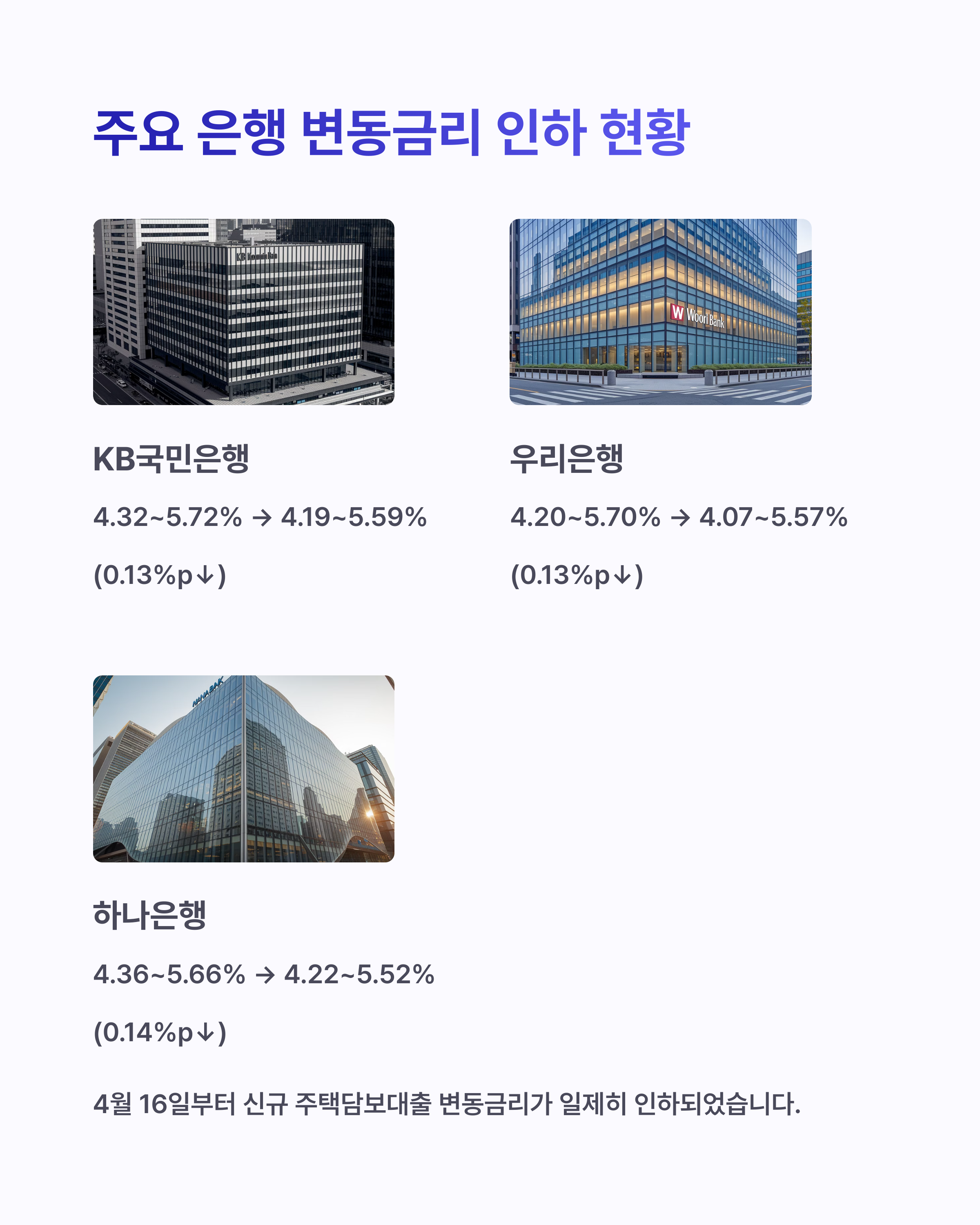 이에 따라 KB국민은행, 우리은행 등 주요 은행의 변동금리 상품도 인하되었습니다.
