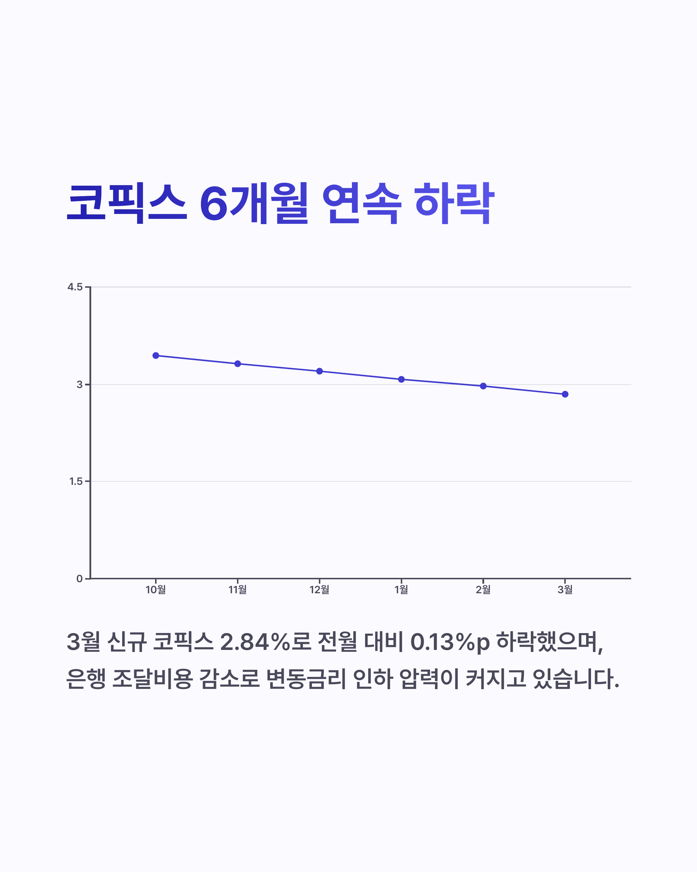 "코픽스 하락은 변동금리 대출자에게 희소식입니다. 신규 취급액 기준 코픽스가 2.84%로 하락했습니다."