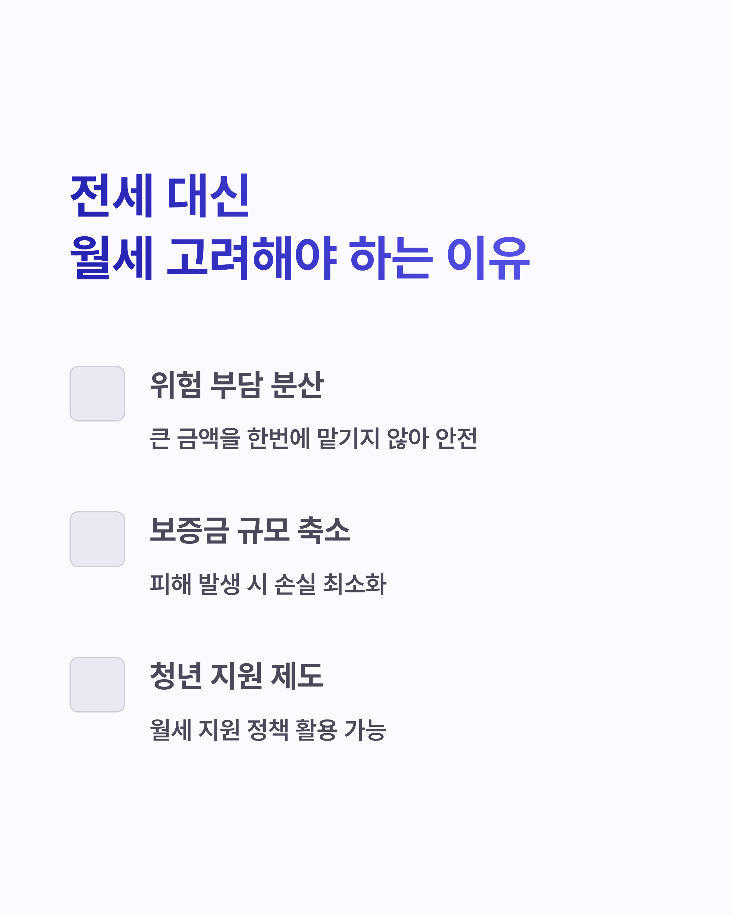 전세사기 리스크를 피하기 위해 월세를 고려하는 것도 좋은 방법입니다.