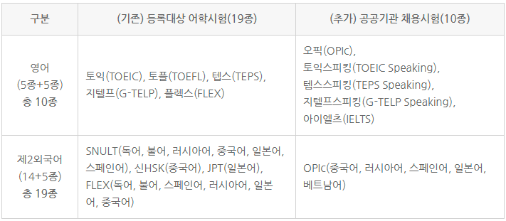 등록 가능한 어학 시험은 영어 10종, 제2외국어 19종으로 총 29종입니다.